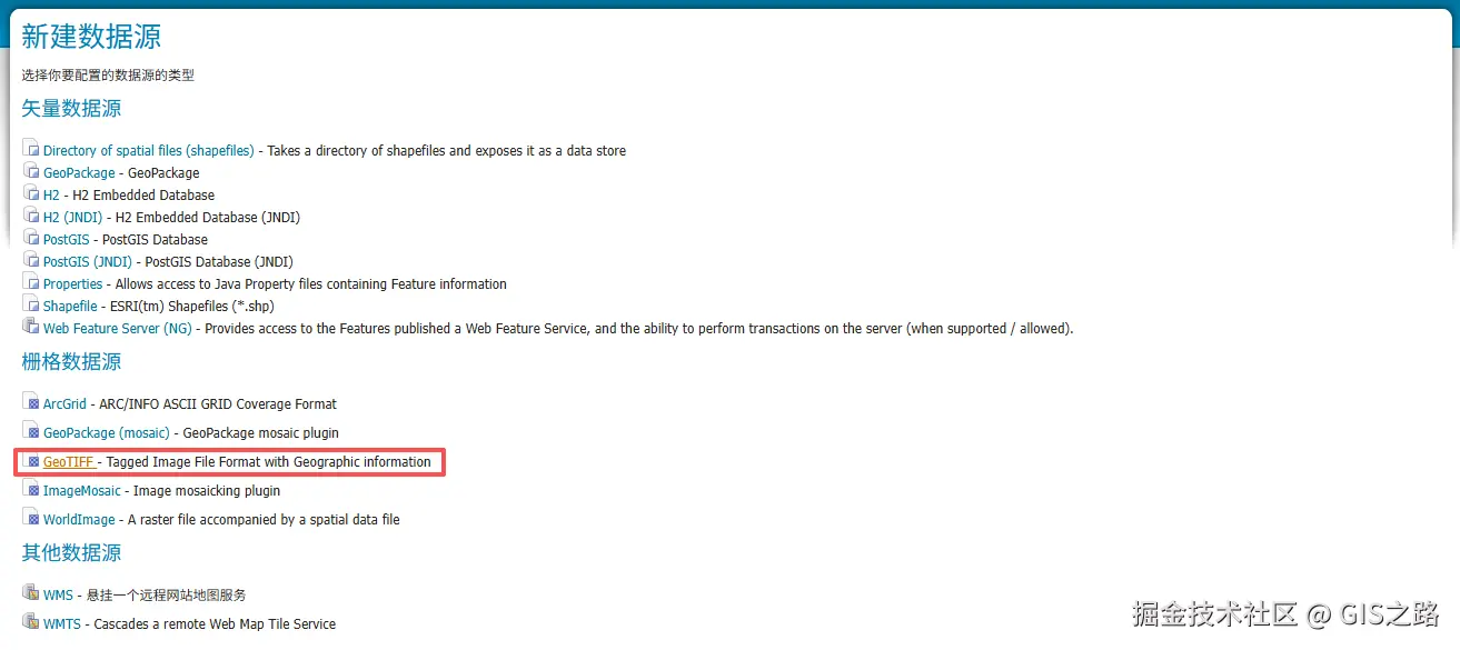 添加了工作空间之后,就可以新建存储仓库了。该存储告诉GeoServer如何连接到GeoTIFF。