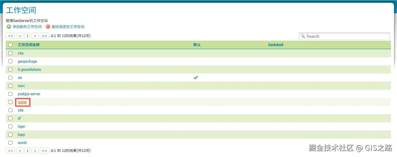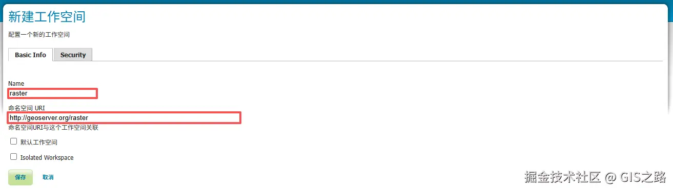 填写工作空间名称为raster,命名空间URI为http://geoserver.org/raster。
