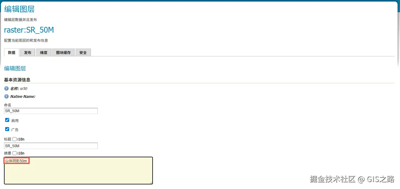 在编辑图层页面填写摘要信息。然后在【坐标参考系统】中选择坐标系统。发布数据前记得查看数据坐标系,GeoServer中默认会使用WGS84,也就是EPSG:4326进行发布。如果数据坐标系不正确,则无法正确计算边框范围,会导致服务无法正常显示。