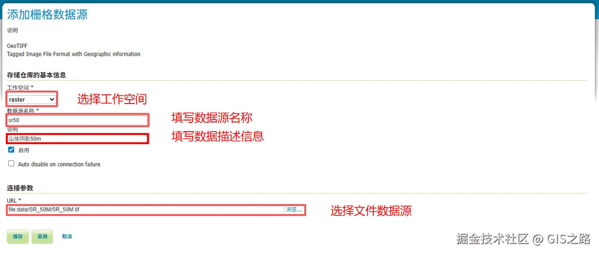 打开新建数据源界面,在栅格数据源下点击GeoTIFF,打开新建矢量数据源界面。在存储仓库基本信息的下拉列表中选择新建的工作空间,然后填写数据源名称和数据说明。在连接参数中选择数据源路径。