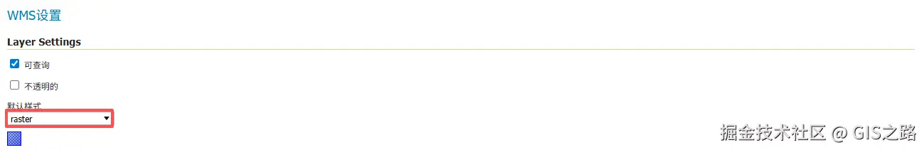 点击顶部【发布】选项卡,浏览到WMS设置,在图层设置中选择默认样式raster。