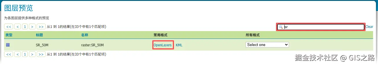 打开图层预览界面,在顶部搜索框键入"sr"进行搜索,找到图层,点击"OpenLayers"查看地图。