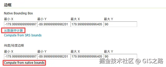 接着在边框选项中计算图层范围。首先点击从数据中计算,生成边框范围,然后点击从原始边界计算。