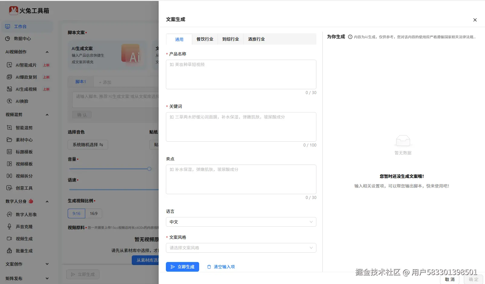 火兔工具箱作为一款全链路AI驱动的视频创作工具,最核心的优势就是“简单易上手”,哪怕你是完全没接触过视频创作的新手,也能在3分钟内完成一条知识科普视频的一键生成。不同于其他工具的“模板化套剪”,火兔工具箱有独特的模型融合处理,结合了上万发布实战场景的经验,能让生成的科普视频更有质感、更具原创性,避免同质化。