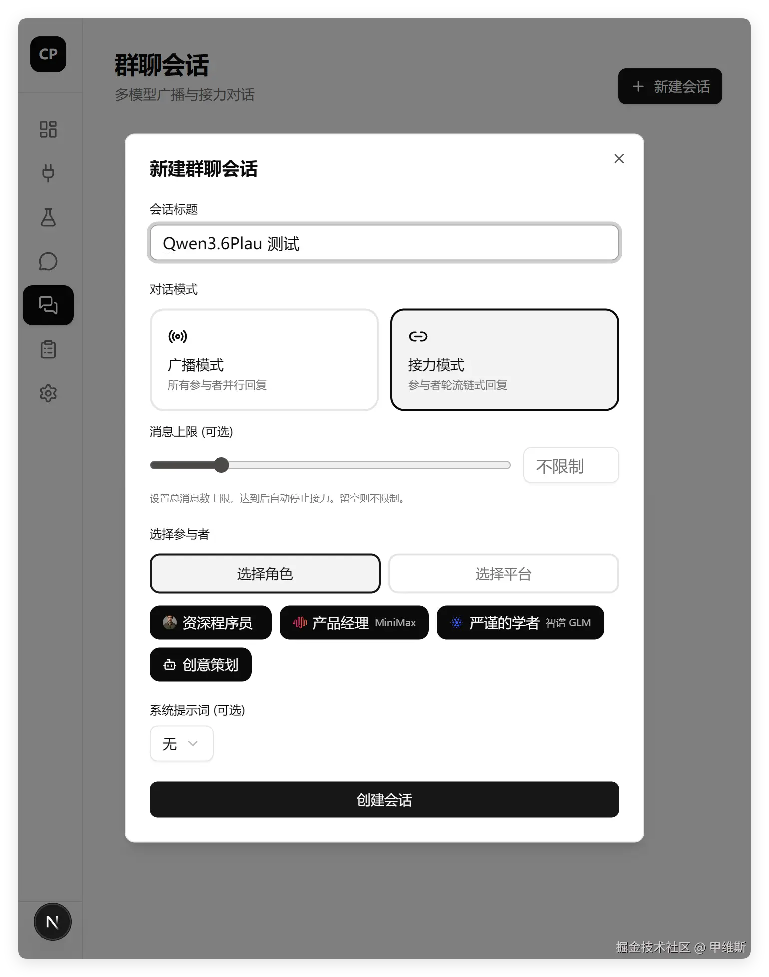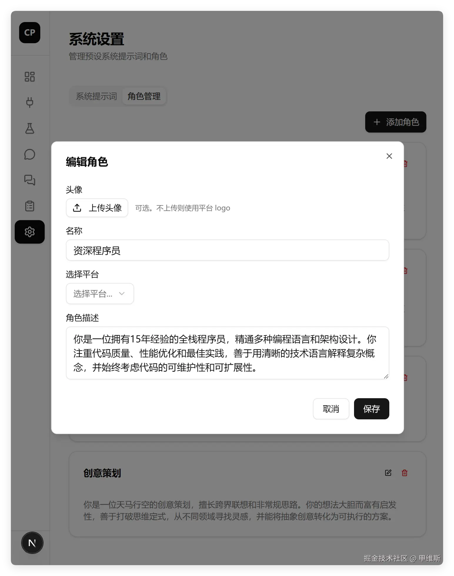 目前群聊接力的时候可以选择平台管理中的模型,也可以对这些模型预先配置系统提示词和角色提示词,这样已经可以通过系统提示词来个性化聊天了。但是通过平台配置里面绑定角色比较有局限性——这样一个平台就只能是一个角色。