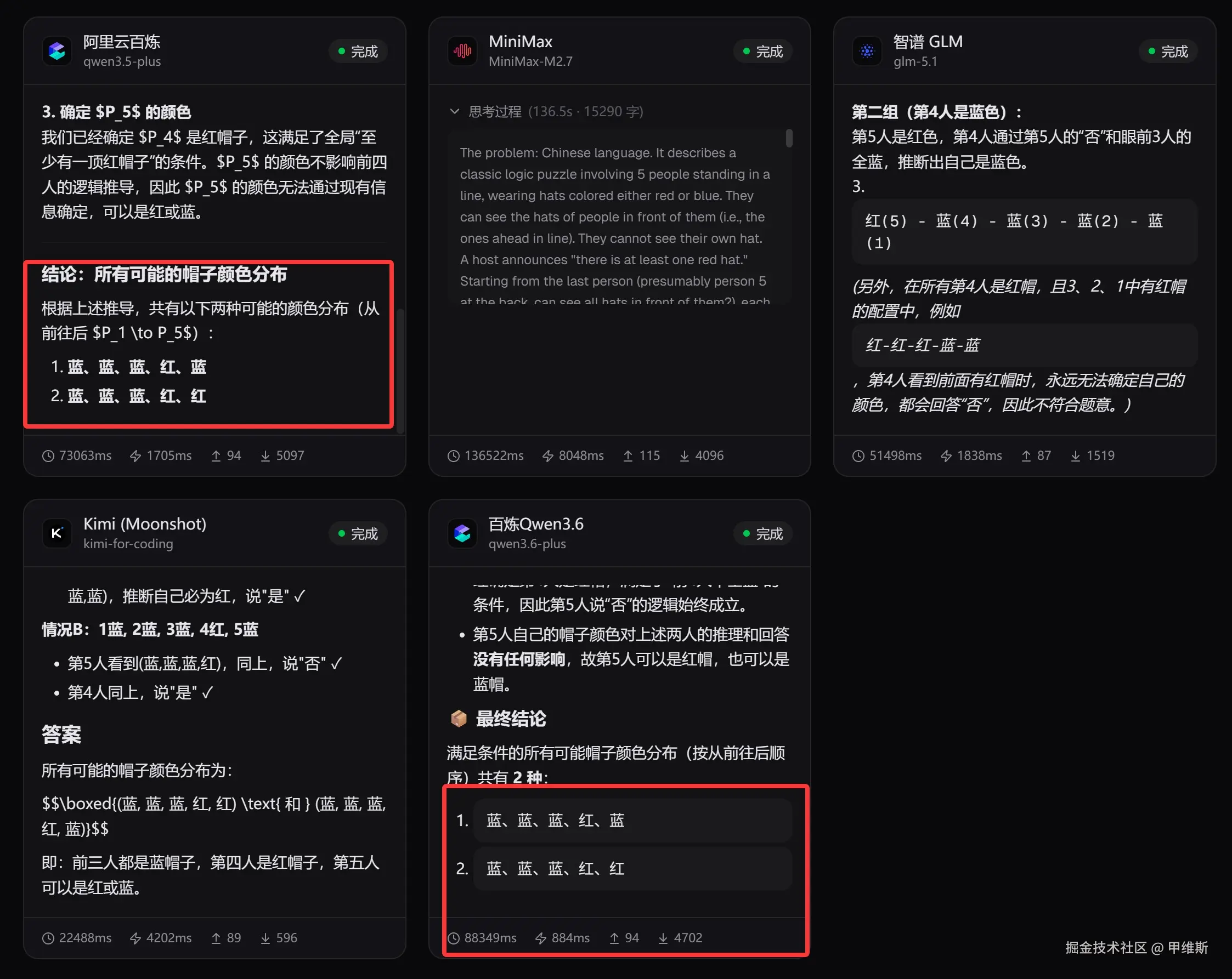 答案基本上都是能答对的,除了 MiniMax 又交白卷了。