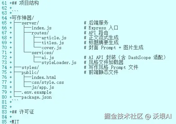 核心的内容生成环节,它做了一个路由层 (routes/)。article.js负责处理正文生成,可以流式输出;titles.js负责批量生成标题和摘要;cover.js负责封面生成,提供Prompt生成+图片下载的功能。