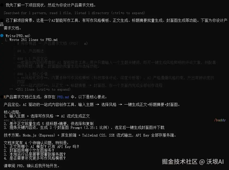 如果你直接让大模型one shot去做一个成品,这大概率是做不出来的……所以,我们先让它写一份PRD(产品需求文档)。