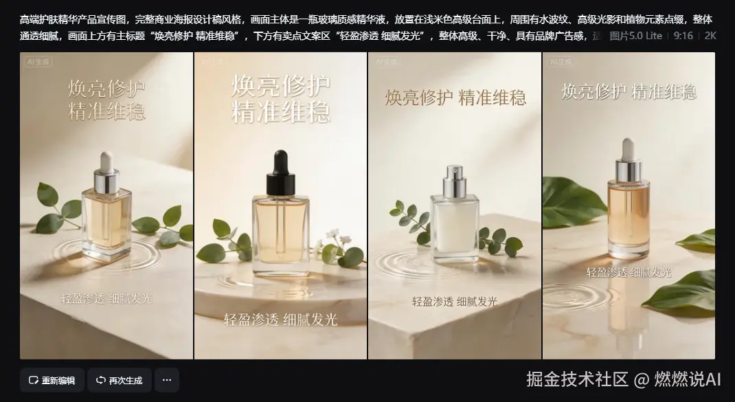 可以这样引导生图: 用途: 产品宣传成品图 建议画面: 直接生成带产品主体、卖点文案区、氛围场景的完整宣传图 生图 Prompt: 高端护肤精华产品宣传图,完整商业海报设计稿风格,画面主体是一瓶玻璃质感精华液,放置在浅米色高级台面上,周围有水波纹、高级光影和植物元素点缀,整体通透细腻,画面上方有主标题“焕亮修护 精准维稳”,下方有卖点文案区“轻盈渗透 细腻发光”,整体高级、干净、具有品牌广告感,适合产品宣传图,竖版构图