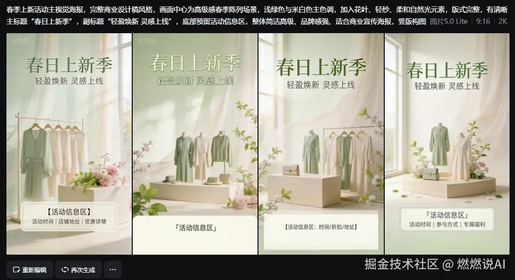 可以这样引导生图: 【这里可用 Seedream 5.0 直接生成完整设计图,方便你后面补图】 用途: 春季活动主视觉成品图 建议画面: 直接生成完整海报感画面,带主标题区、卖点信息区、品牌活动氛围 生图 Prompt: 春季上新活动主视觉海报,完整商业设计稿风格,画面中心为高级感春季陈列场景,浅绿色与米白色主色调,加入花叶、轻纱、柔和自然光元素,版式完整,有清晰主标题“春日上新季”,副标题“轻盈焕新 灵感上线”,底部预留活动信息区,整体简洁高级、品牌感强、适合商业宣传海报,竖版构图