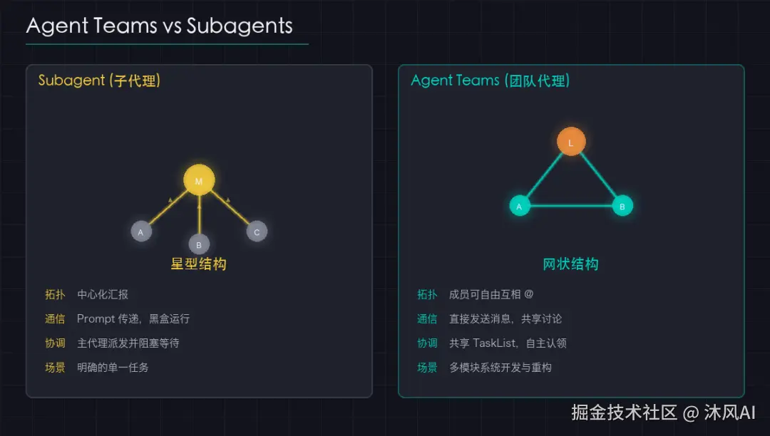 理解两者的本质差异是正确使用 Agent Teams 的前提: