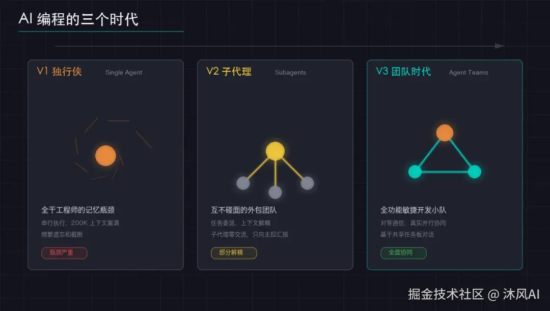 这正是传统单 Agent 模式的天花板。而 Claude Agent Teams 的出现,将 AI 编程从"一个人硬扛"推进到了"一支团队协作"的新阶段。