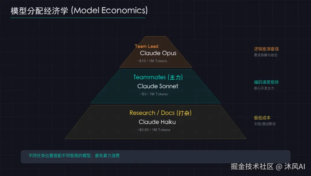 | Team Lead(大脑) | Claude Opus | ~$15/1M Tokens | 逻辑推演最强,负责需求拆解、分发与最终综合 |