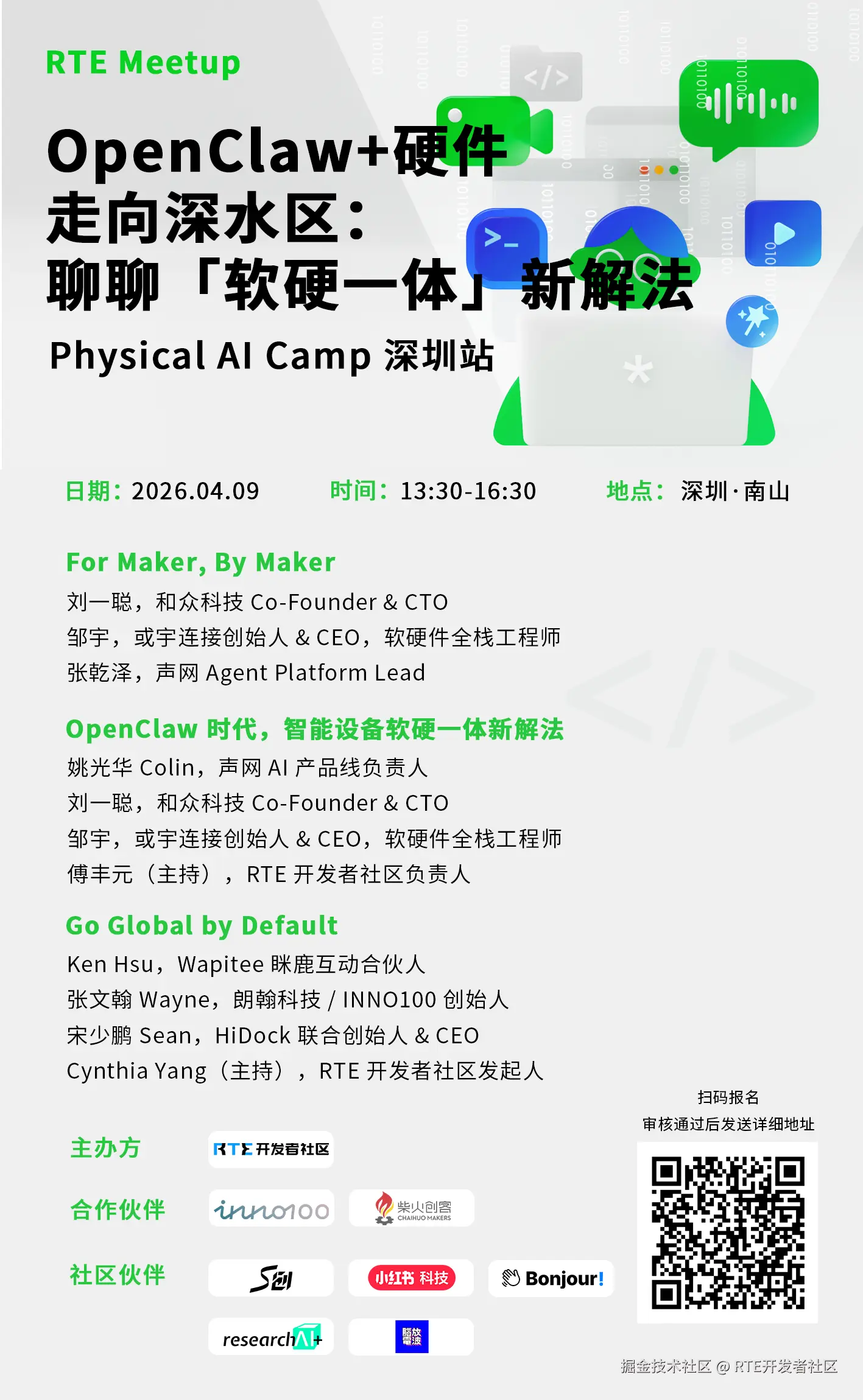 4 月 9 日(周四)下午,RTE Meetup 落地硬件与创客大本营——深圳。在这场 Meetup 里,我们邀请了来自声网、ClawStage、WatcheRobot、眯鹿互动、Inno100 和 HiDock 的技术专家与出海实战专家,一站式把从「软硬结合」到 「硬件出海」的话题聊透。