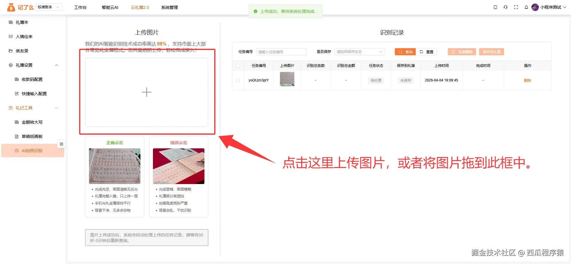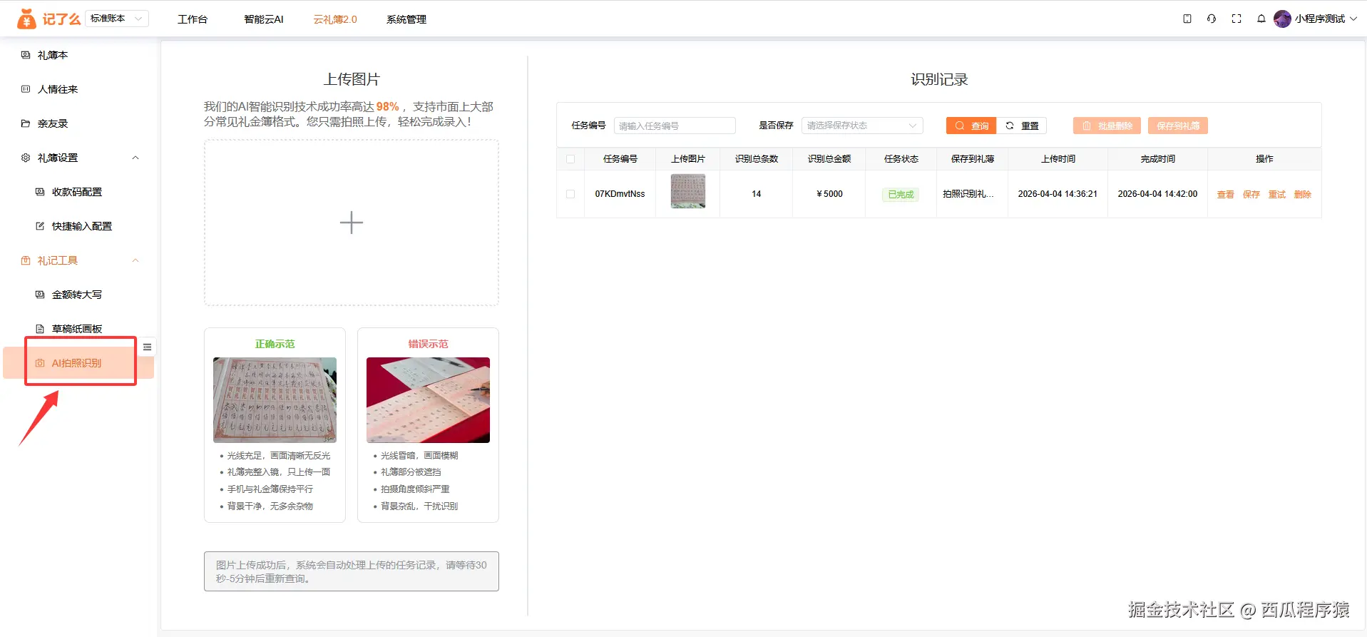 保存后可以在云礼薄2.0-礼薄本,点击【去收礼】查看明细。从识别记录保存的礼薄可以点击查看大图,方便主家核对。