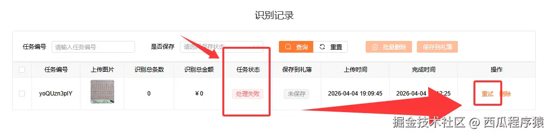 如果遇到任务状态为 [处理失败],可能是系统网络有波动、或者使用人数过多,不用担心,只需要点击【重试】按钮即可重新提交任务工单,系统会再次进行识别(注意:如果重试3次依然失败,可能是上传图片存在问题,请换一个角度重新拍摄上传)。