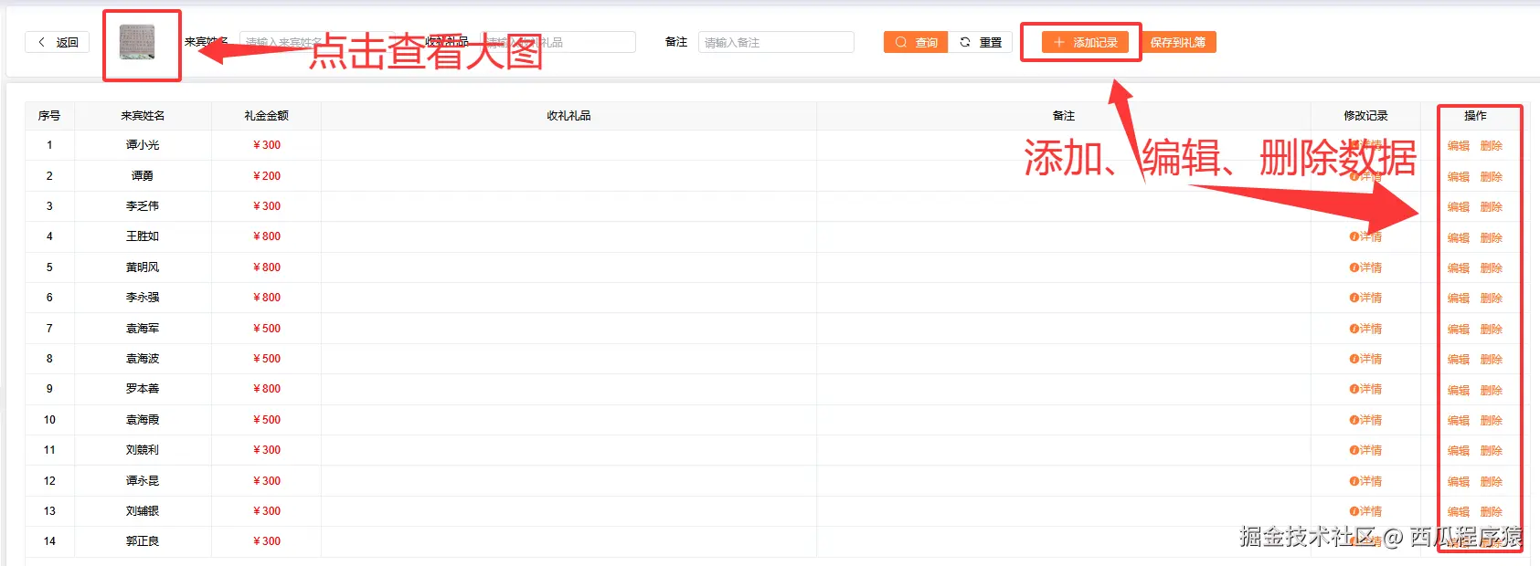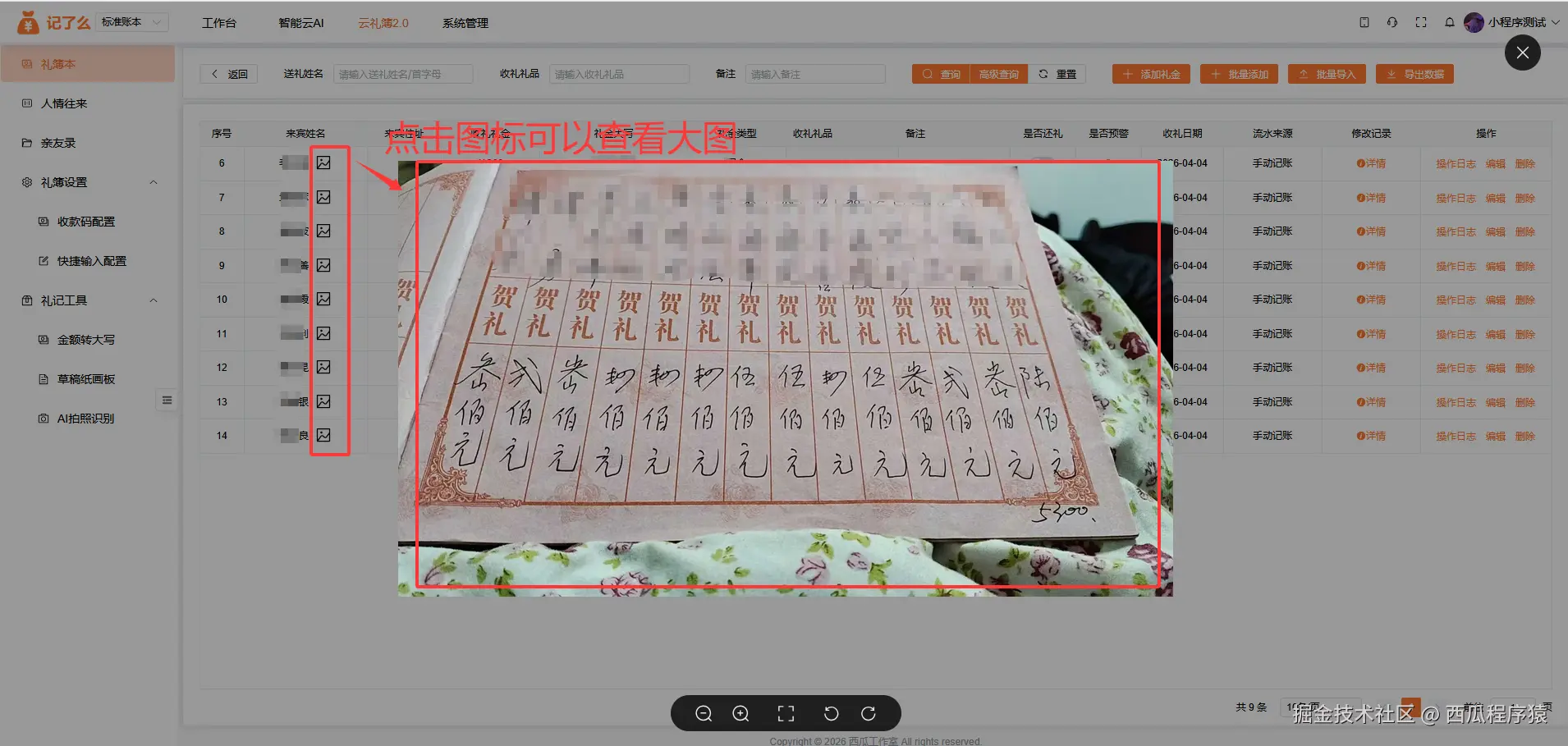 小程序端在礼薄本-收礼明细,也支持查看大图。
