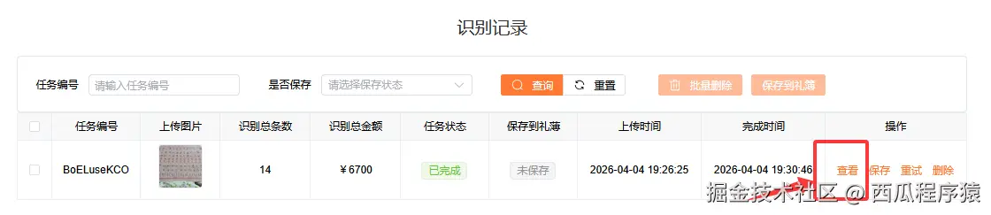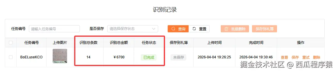 等待片刻后,点击【查询】按钮重新刷新一下,可以看到任务状态已经为 [已完成] 了,然后系统自动计算出识别总条数、识别总金额(注意:如果识别结果不理想,可以点击【重试】按钮重新提交工单,系统会重新进行识别,需要注意点击重试会清空之前的识别记录)。