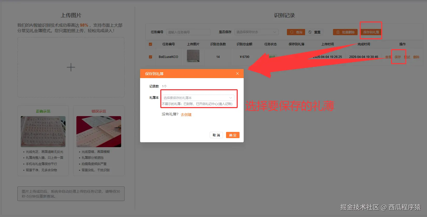 数据核对没问题后,可以批量选择识别记录然后点击【保存到礼薄】,或者点击【保存】可以将识别数据保存到礼薄本中。