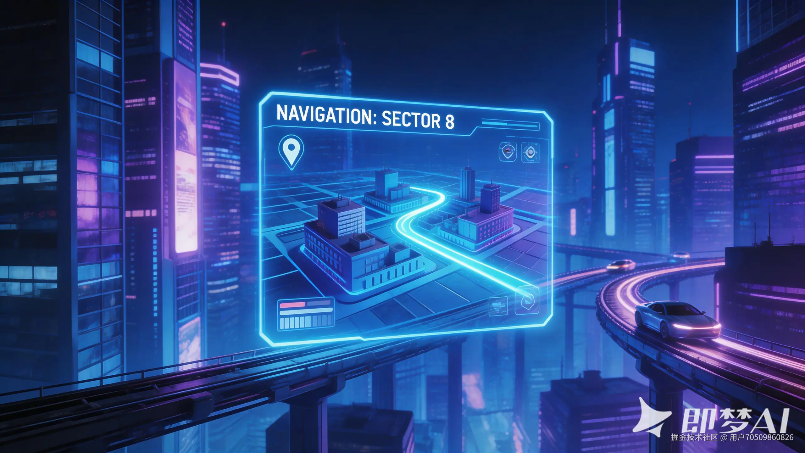 延续“未来之城”主视觉的赛博朋克霓虹灯光与玻璃建筑风格,生成一张适用于手机竖屏海报的构图。焦点变为一个发光的悬浮导航界面,展示城市某个街区的三维地图,背景依然是密集的摩天楼与空中交通轨道。保持相同的蓝紫色调与光污染氛围。