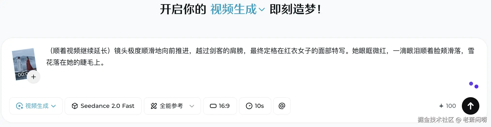- 导演痛点: 剧本要求一镜到底:从两人在雪中离别的全景,慢慢推近到女主落泪的眼部特写。这种长镜头情绪表达,传统碎片化 AI 根本做不到。
