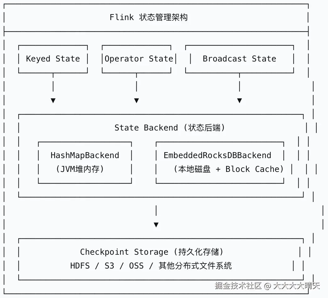 状态后端(State Backend)是Flink内部管理状态的底层存储引擎,负责状态的序列化与反序列化、本地存储、Checkpoint生成与恢复,以及与外部持久化系统的交互。Flink之前提供三种状态后端存储(HashMapStateBackend/FsStateBackend/EmbeddedRocksDBStateBackend),后来第二种被官方废弃了。HashMapStateBackend状态存储在TM的JVM内存,CP/SP存储在JM的JVM内存,状态大小受限于JobManager内存,一旦JobManager宕机,所有状态将永久丢失,因此不推荐在生产环境使用;EmbeddedRocksDBStateBackend状态存储在本地磁盘+Block Cache,CP/SP存储在配置的持久化文件系统,适合大状态存储,支持增量Checkpoint,生产环境下首选。