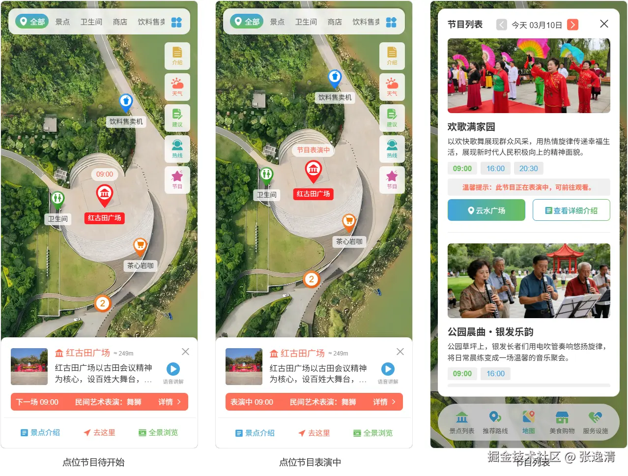 - 表演中:醒目标注「表演中」,提示游客可前往观看