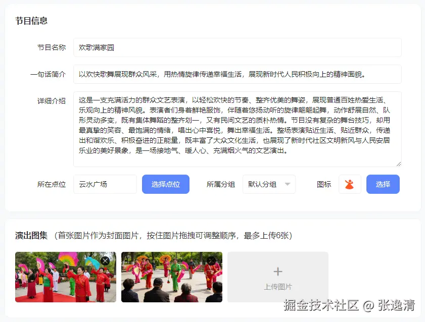 - 视觉包装:上传最多 6 张演出图集,首图自动作为分享封面;支持自定义节目图标,强化视觉识别。