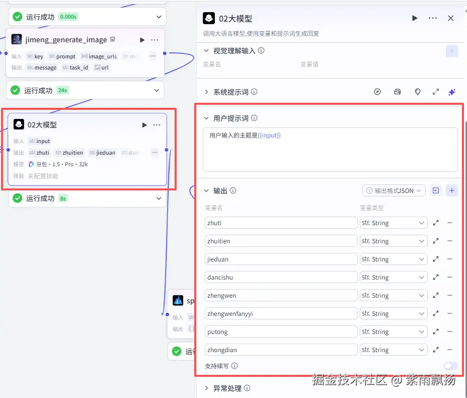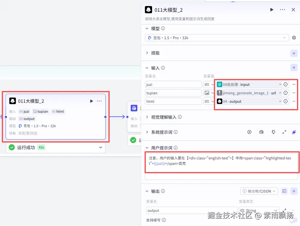 该节点的作用是根据上面大模型生成的内容通过大模型节点来进行HTML格式的排版,系统提示词比较长,需要的可以在文末统一来获取。