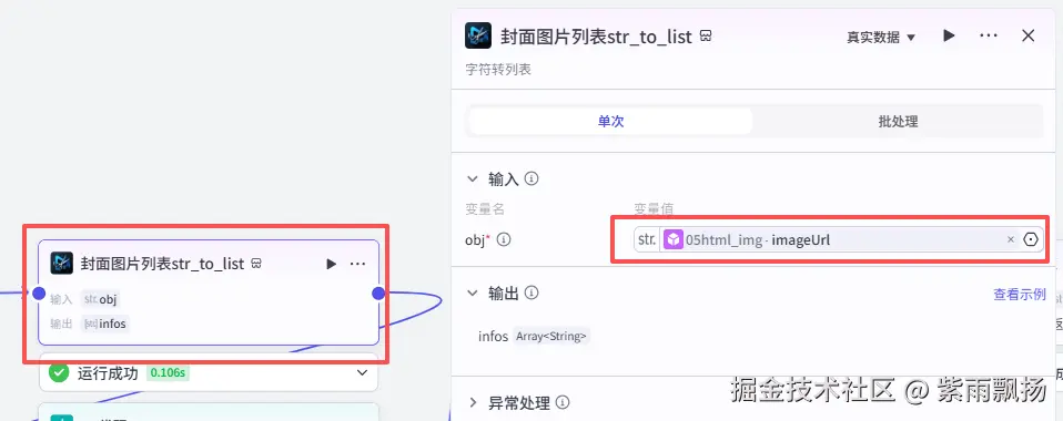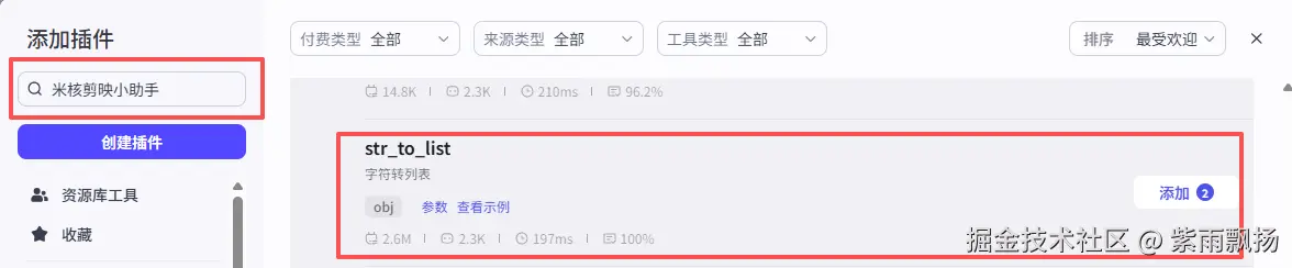 添加一个第三方的插件米核的 【剪映小助手】 的 【str_to_list】 节点->设置参数;