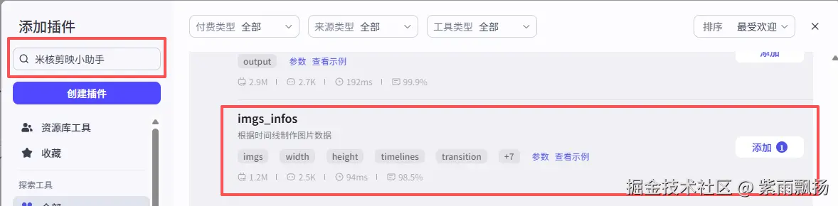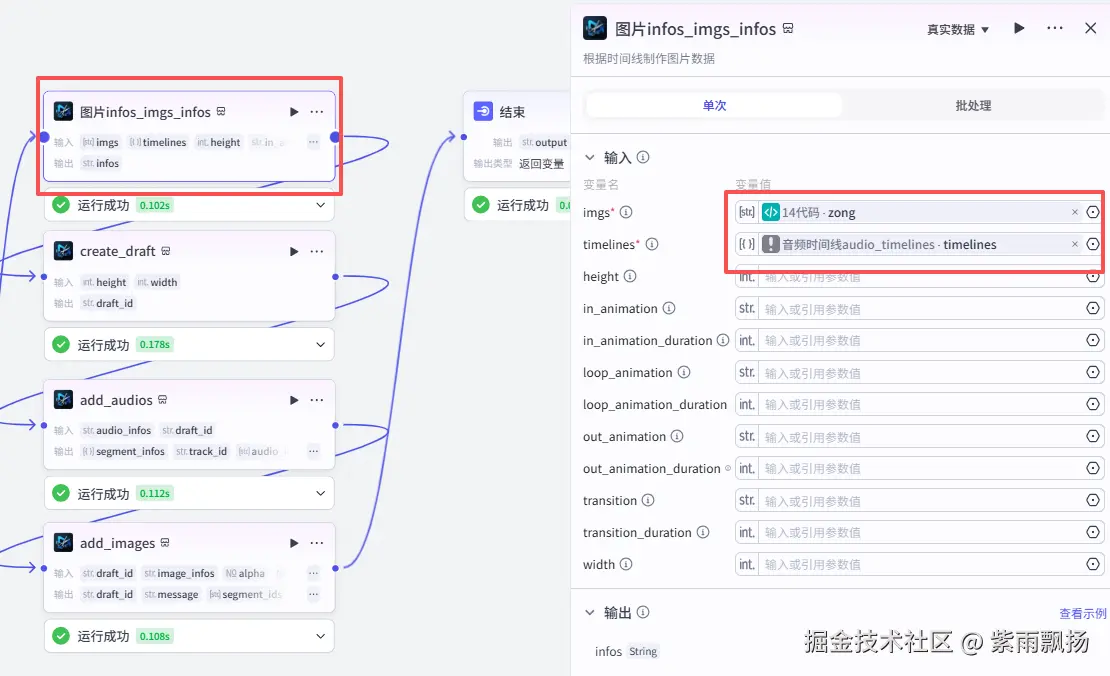 添加一个第三方的插件米核的 【剪映小助手】 的 【imgs_infos】 节点->设置参数;