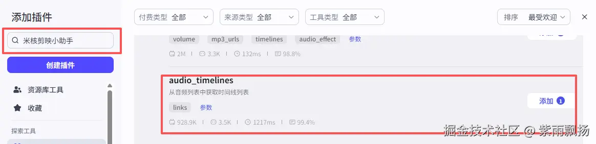 添加一个第三方的插件米核的 【剪映小助手】 的 【audio_timelines】 节点->设置参数;