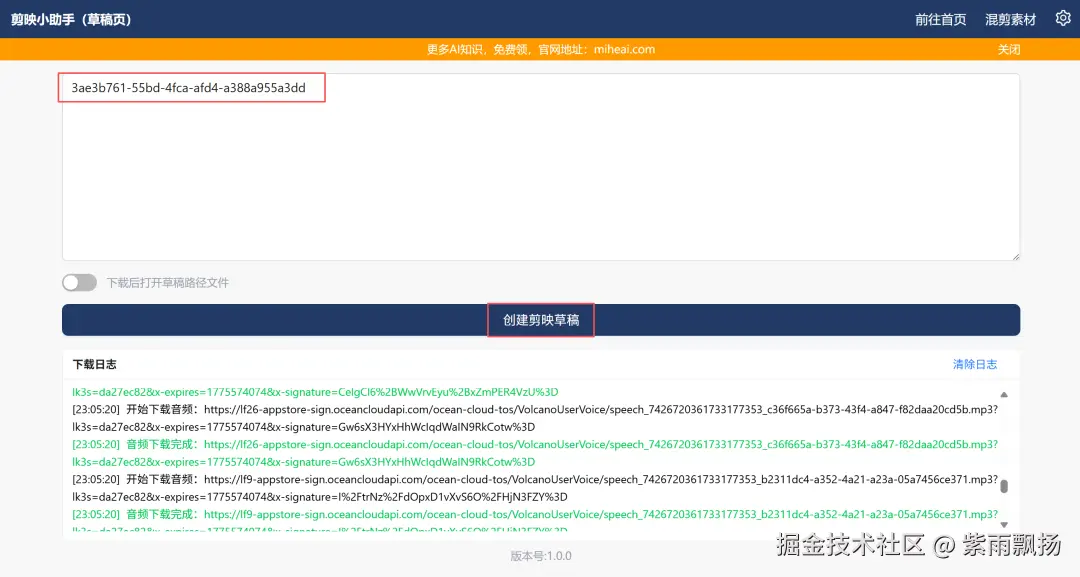 (2)将上一步中的的草稿ID输入剪映小助手,点击创建草稿;