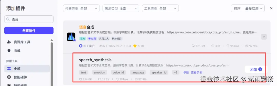 添加一个 【语音合成】 节点->设置参数;