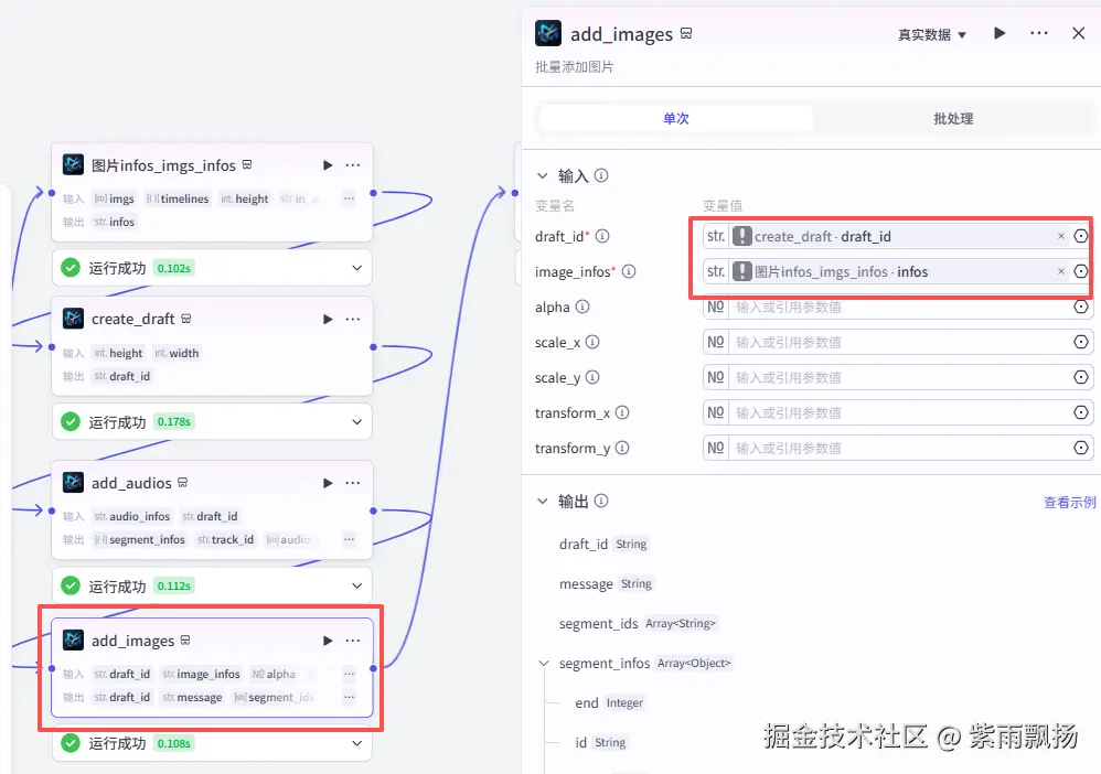 添加一个第三方的插件米核的 【剪映小助手】 的 【add_images】 节点->设置参数 ;