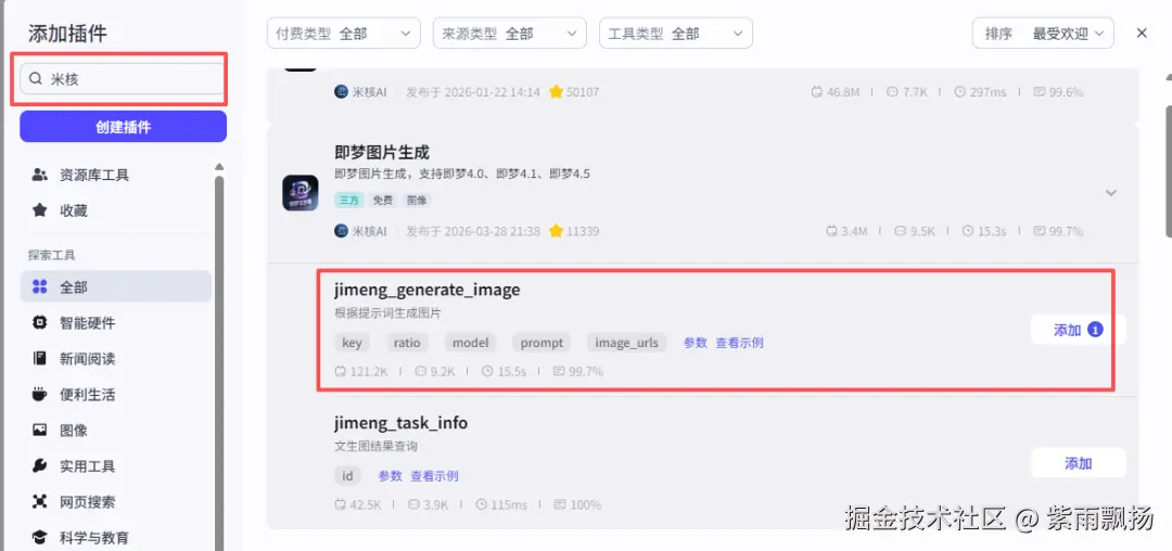 添加一个第三方的米核 【即梦图片生成】的【jimeng_generate_image】 节点->设置参数;
