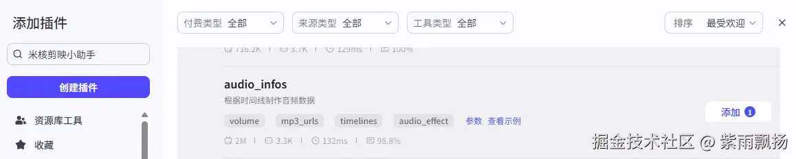 添加一个第三方的插件米核的 【剪映小助手】 的 【audio_infos】 节点->设置参数;