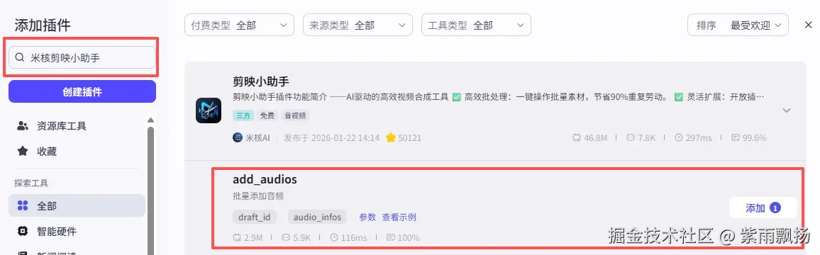 添加一个第三方的插件米核的 【剪映小助手】 的 【add_audios】 节点->设置参数;