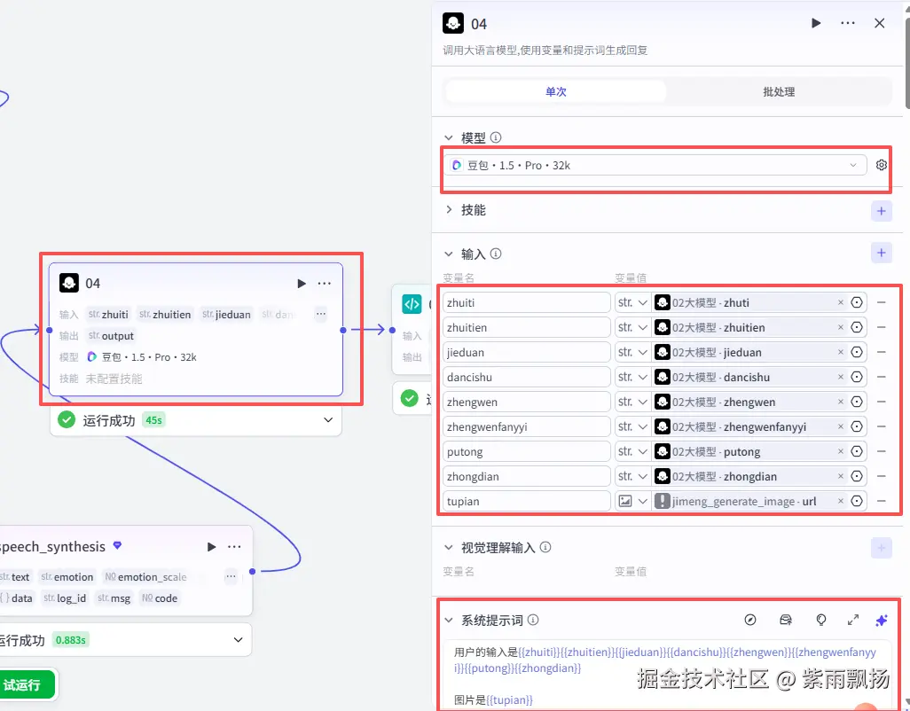 添加一个 【大模型】 节点->设置参数及提示词;