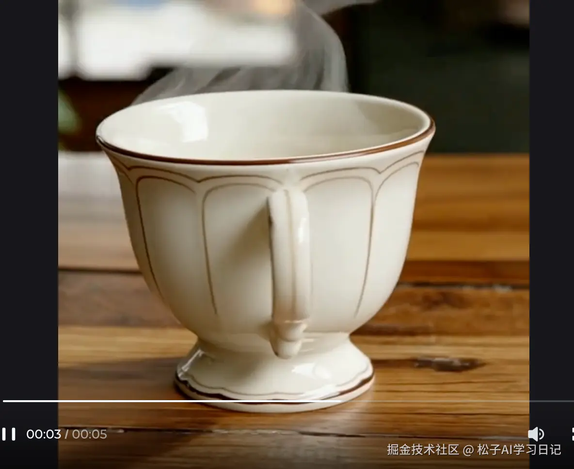 三分钟后,视频出来了。画面里杯子质感高级,光影真实,连咖啡冒的热气都清晰可见。背景音乐是舒缓的爵士钢琴,听着就让人想喝咖啡。