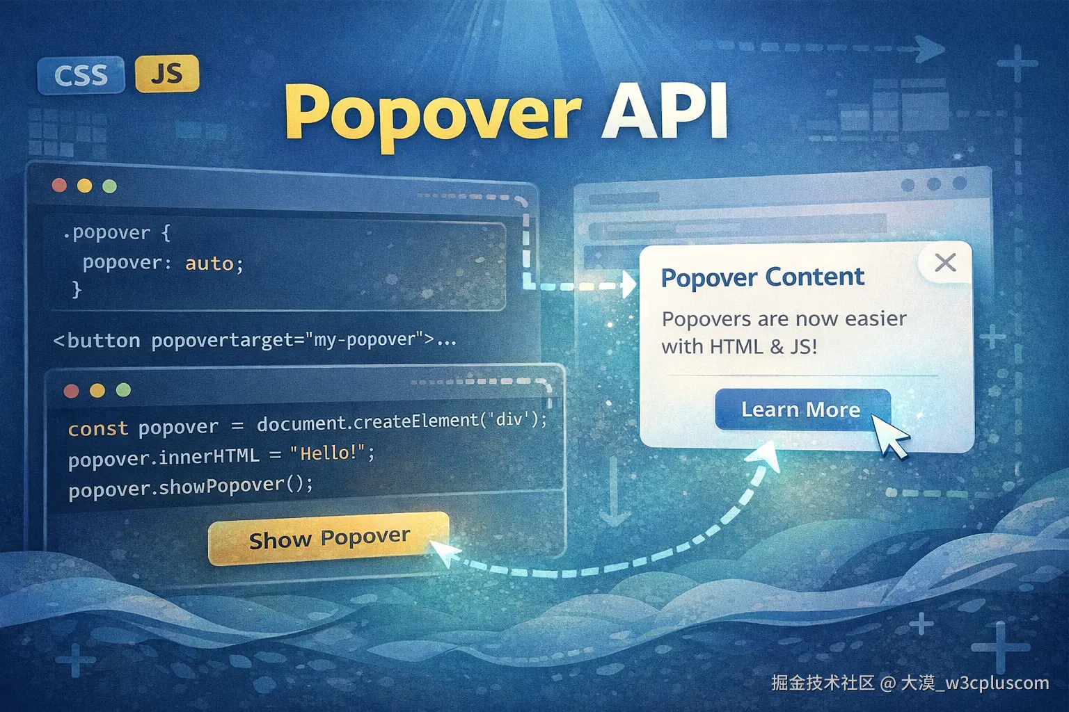 而现在,事情变得简单得多。通过 HTML 的 popover 属性以及配套的 popovertarget ,你只需要少量的 HTML 结构,就可以获得一个原生、可访问的 Popover 组件。浏览器会自动帮你处理一系列关键行为,包括显示与隐藏的切换、点击外部关闭、按下 Escape 键关闭、使用 ::backdrop 创建背景遮罩、焦点管理,以及顶层渲染(popover 始终会显示在页面最上层,无需再处理复杂的 `z-index``)。