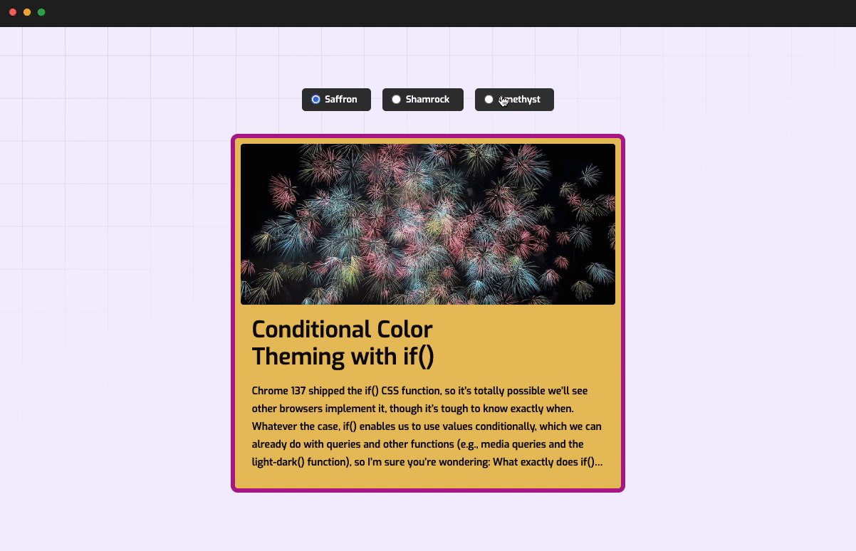 实际上,上面的主题示例,即使不使用 if(),也可以通过 @container style() 查询来实现。你可以根据容器中定义的样式变量(例如主题标识),在不同条件下应用对应的样式规则。这种方式同样能够实现按需切换主题效果,并且完全基于 CSS 的声明式能力完成。
