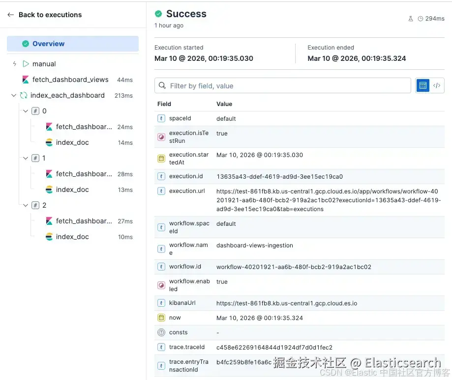 Elastic Workflows 非常适合这类周期性数据采集场景,因为数据源(Kibana API)和目标(Elasticsearch)都是原生的,这意味着无需管理凭据。Workflow 引擎会自动为 kibana.request 和 elasticsearch.request 步骤处理认证,你只需要编写业务逻辑即可。