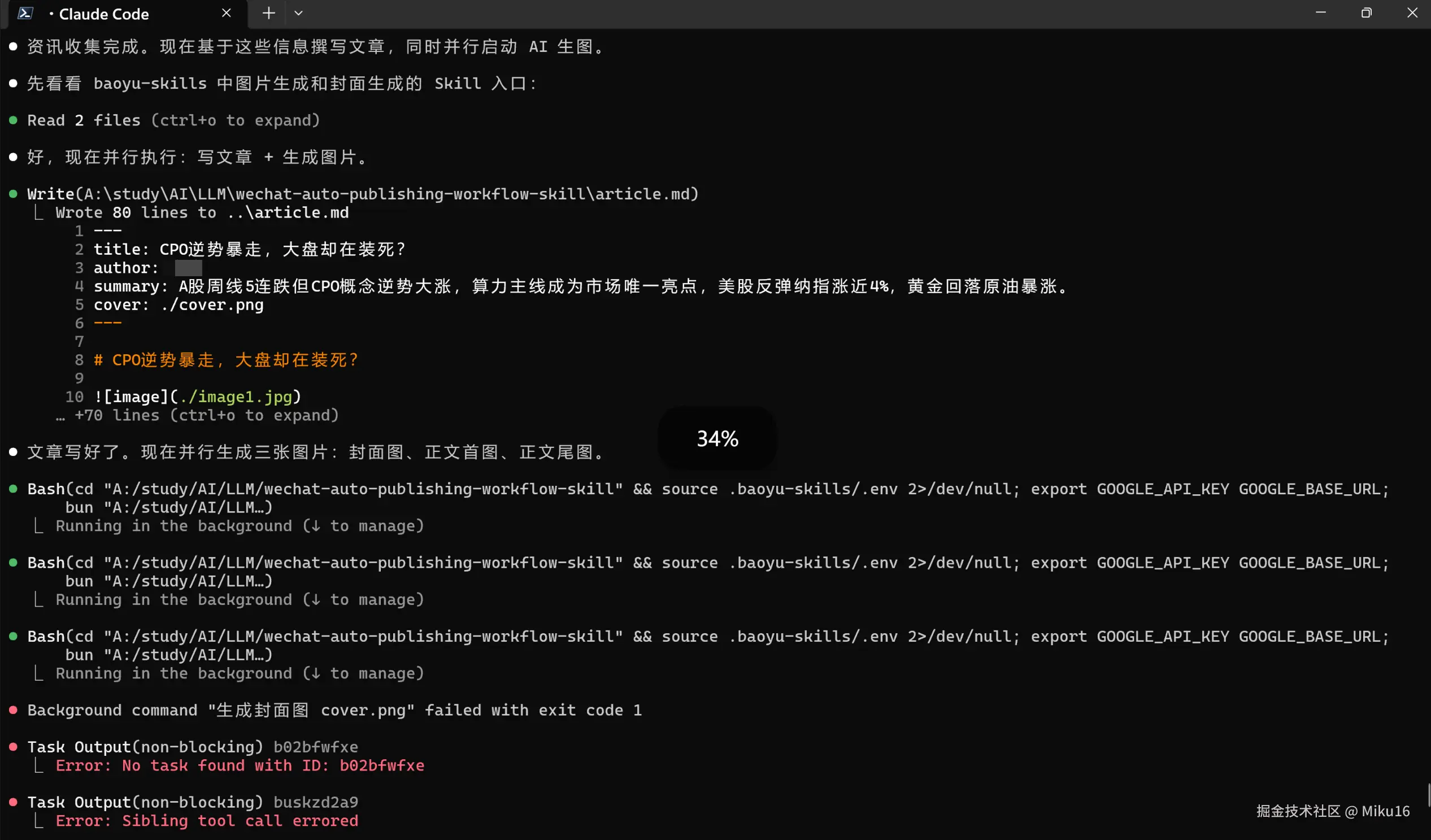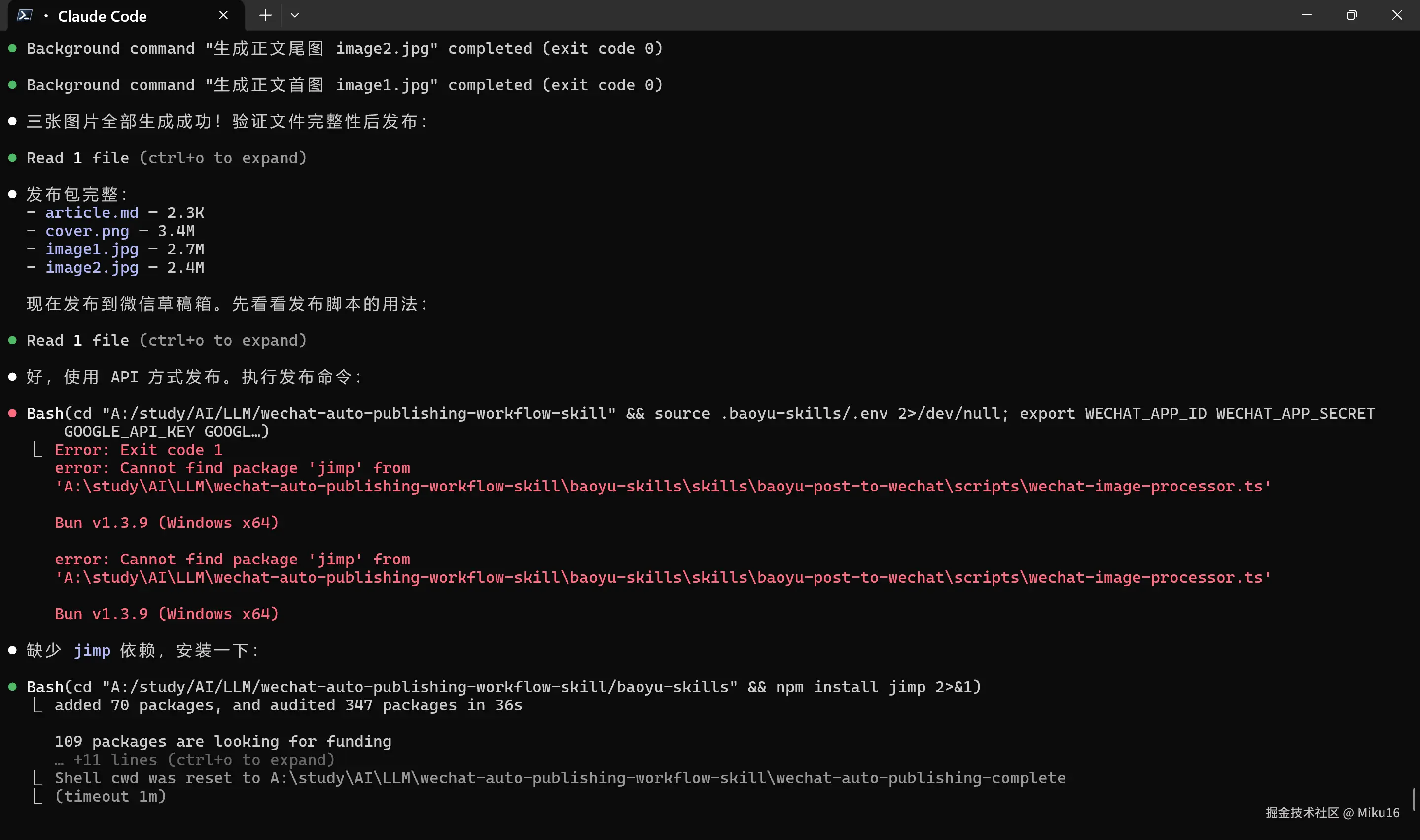 确保 article.md + cover.png + image1.jpg + image2.jpg 齐全,校验编码和路径。