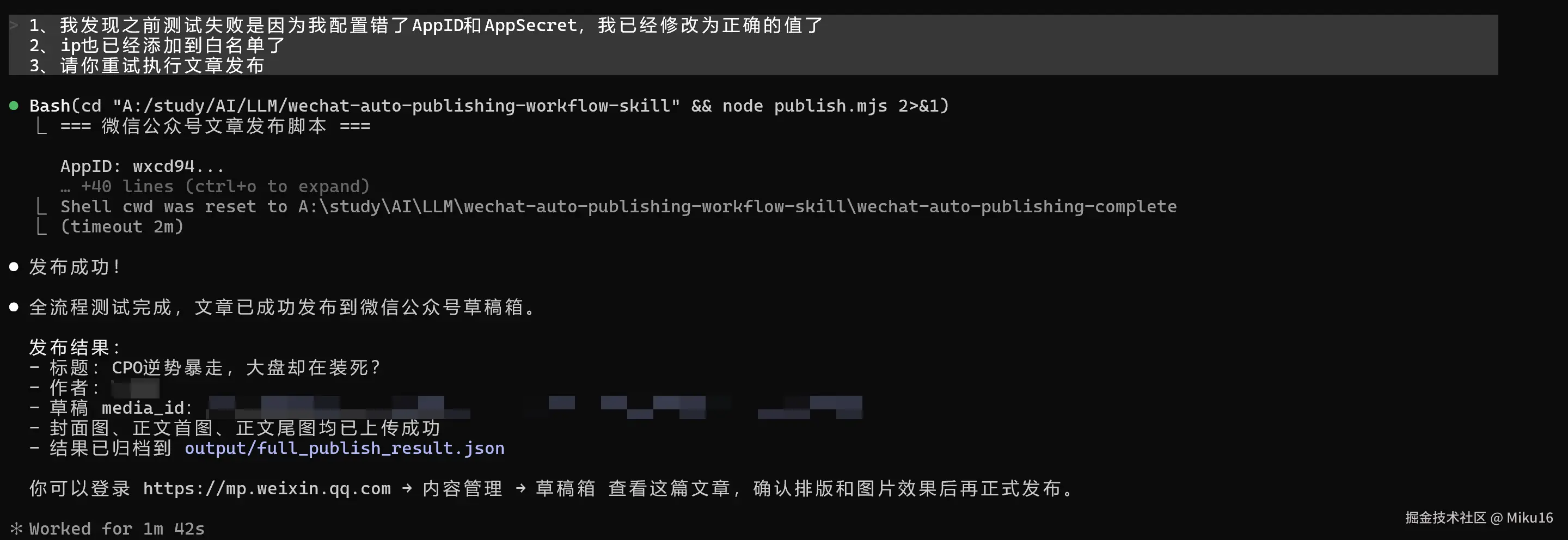 通过微信公众号 API 将文章发布到草稿箱,验证返回有效 media_id。