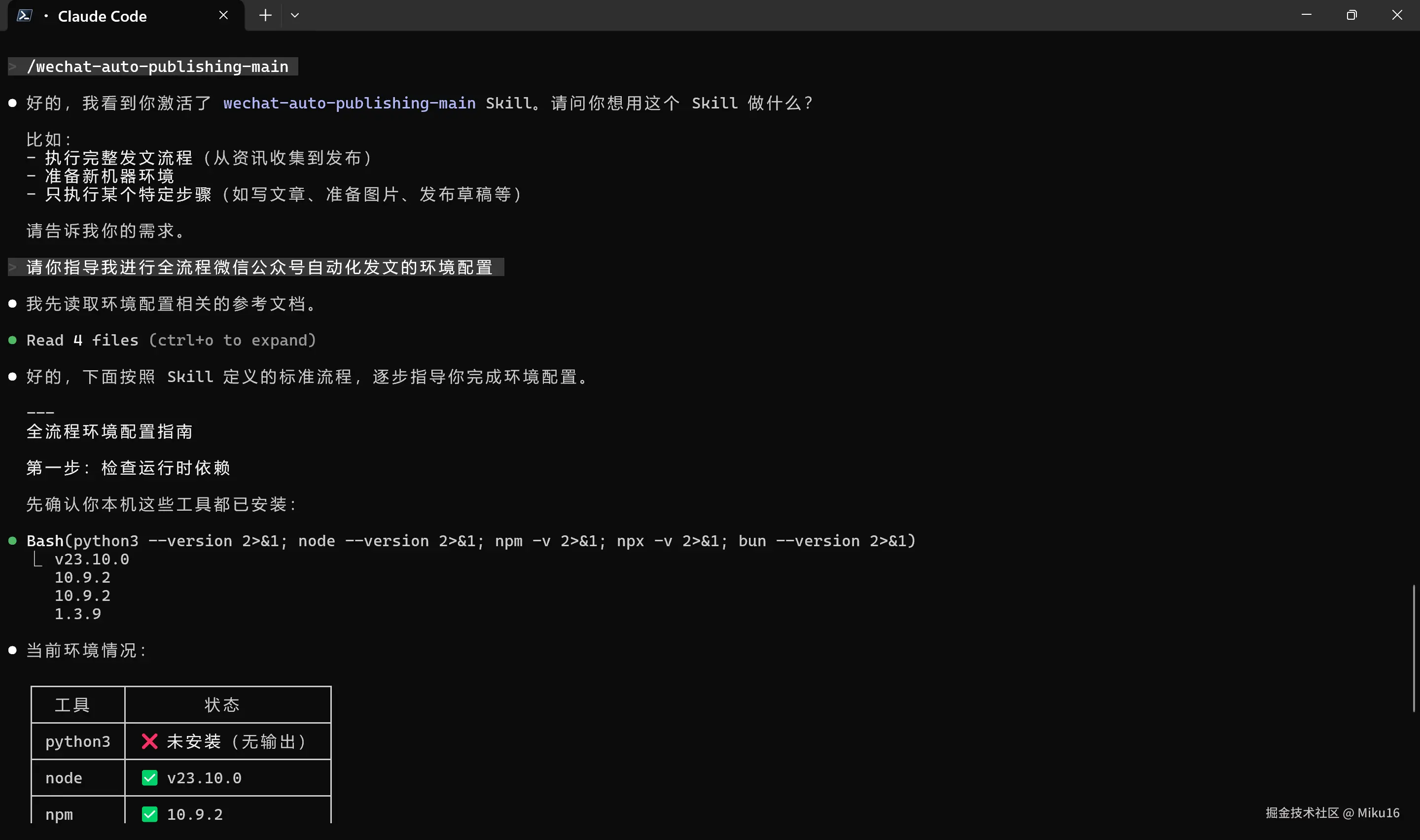 如果这一切都能交给 AI 自动完成呢? 这正是本项目要解决的问题。它不是一个传统的代码项目,而是一个面向 Claude Code(Anthropic 官方 AI 编程助手)的 Skill 指令 包——通过一份结构化的 SKILL.md 文件,指挥 AI Agent 按照标准化流程,自动完成公众号发文的全部环节。
