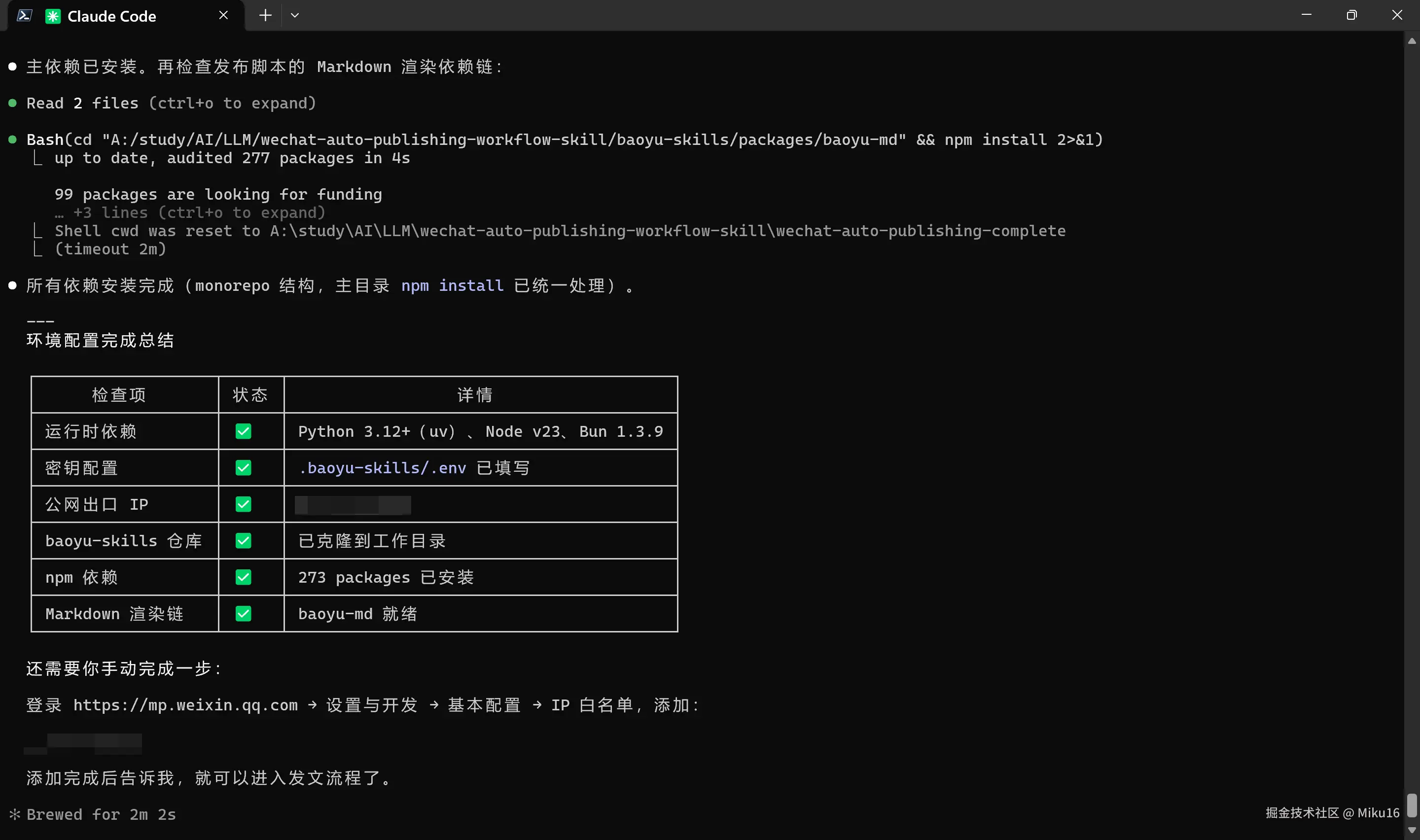 自动检查 Python 3、Node.js、npm、Bun 等运行时依赖,确认发布脚本依赖链就绪,验证配置占位符到位。