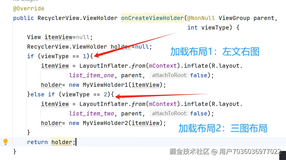 继承与泛型:NewsAdapter 继承自 RecyclerView.Adapter<RecyclerView.ViewHolder>,这里选择使用基类 ViewHolder 而非具体的子 ViewHolder,核心原因是我们的 Adapter 需要处理两种不同类型的列表项布局(左文右图、三图布局),对应两种不同的 ViewHolder。使用基类可以实现统一的适配逻辑,让 Adapter 能够根据不同的布局类型,灵活返回对应的 ViewHolder 实例,满足多布局列表的展示需求,同时也提升了代码的通用性和可扩展性。