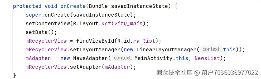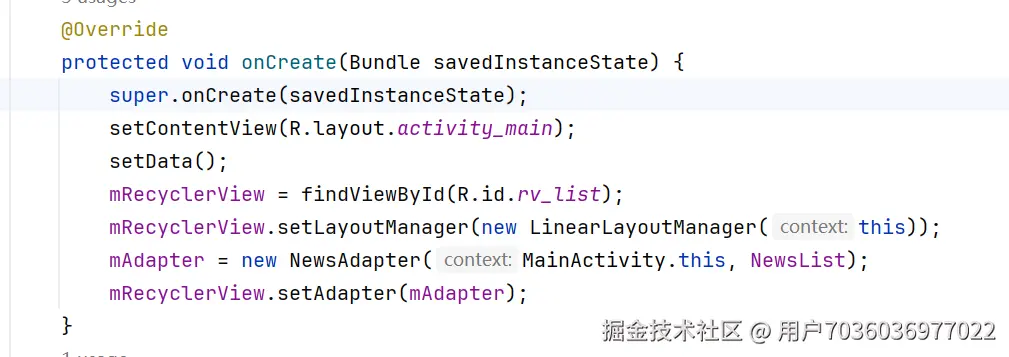 这部分代码位于 Activity 的 onCreate 方法中(Activity 启动时会优先执行),核心作用是“搭架子”,将数据、适配器与 RecyclerView 控件连接起来,完成初始化操作。具体流程如下: