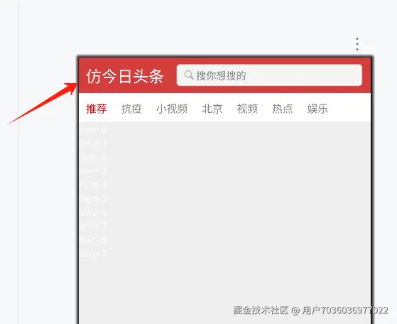 标题栏左侧为应用标题文本,对应代码中的 TextView 控件,文字内容为仿今日头条,采用白色加粗样式与合适字号,在红色背景下醒目清晰,控件设置了合理的右侧间距,与搜索框保持舒适距离,垂直居中的展示效果也与图片完全契合。标题栏右侧是核心的搜索输入框,对应代码中的 EditText 控件,通过权重属性实现自适应宽度,自动填充标题栏剩余空间,这一布局逻辑让搜索框在不同屏幕尺寸下都能完美适配,与图片中搜索框占满右侧区域的效果一致。搜索框使用圆角白色背景资源,搭配灰色提示文字搜你想搜的,左侧预留图标位置,内部文字垂直居中,输入框的高度、间距、内边距等属性设置,都让视觉效果与图片中的圆角搜索框完全匹配,同时代码中配置的单行输入、软键盘搜索功能,也为用户交互提供了便捷性。标题栏所有控件均设置唯一标识,方便后续在代码中实现点击、输入监听等逻辑,提升了布局的实用性与扩展性。